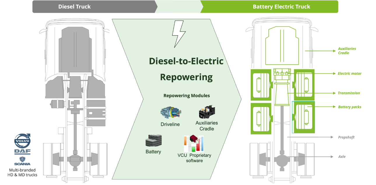 Modular repowering Heavy-Duty (HD) trucks— from Diesel to Full Battery Electric — in only 1 week.